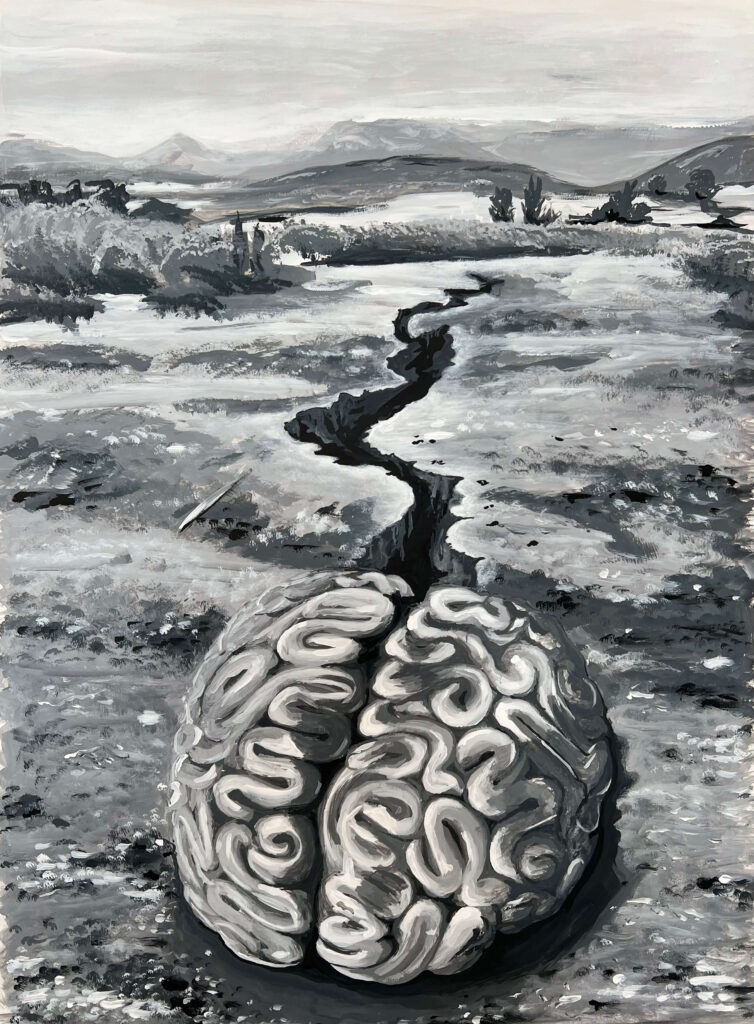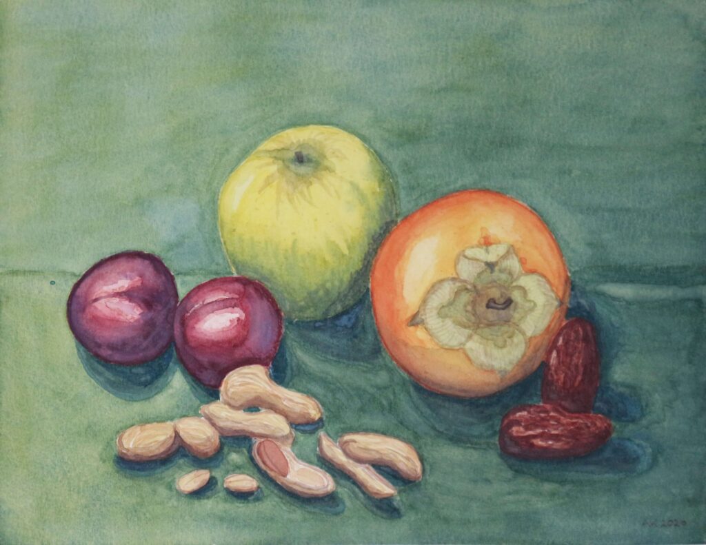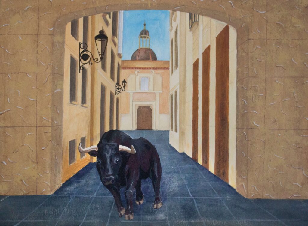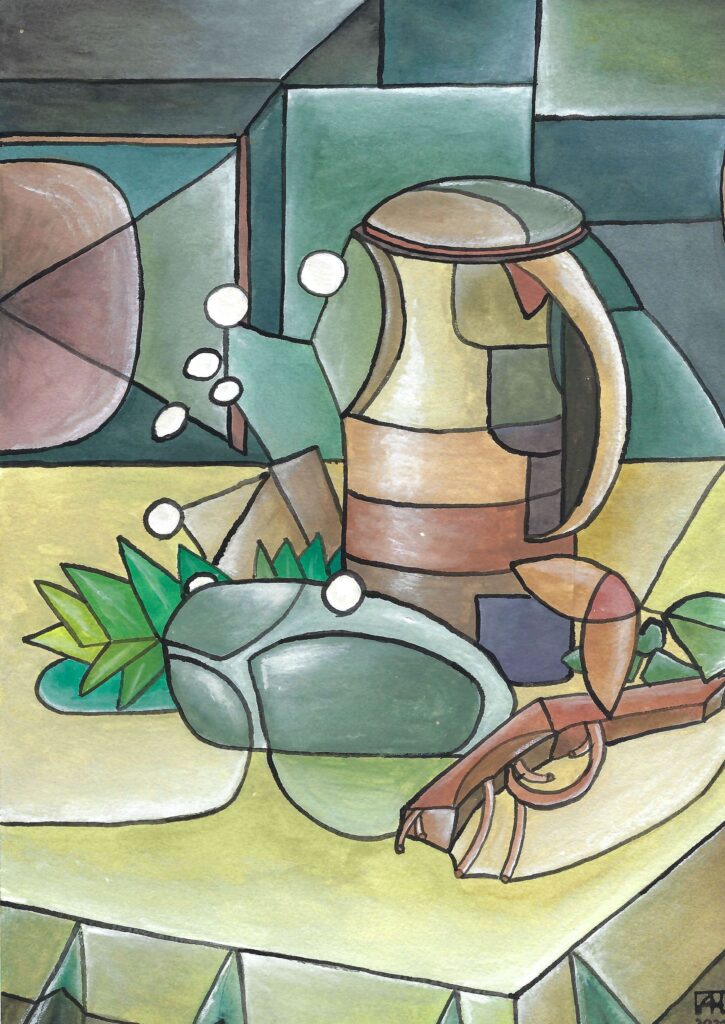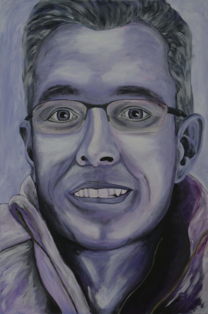 „Stilleben mit Stein“ (Gouache) „Stilleben mit Khaki“ (Aquarell) „Stier in Valencia“ (Acryl) „Am Stand“ (Öl) „Die Kluft“ (Gouache) „Insanus“ (Aquarell) Portrait Bleistift Portrait Acryl auf Leinwand